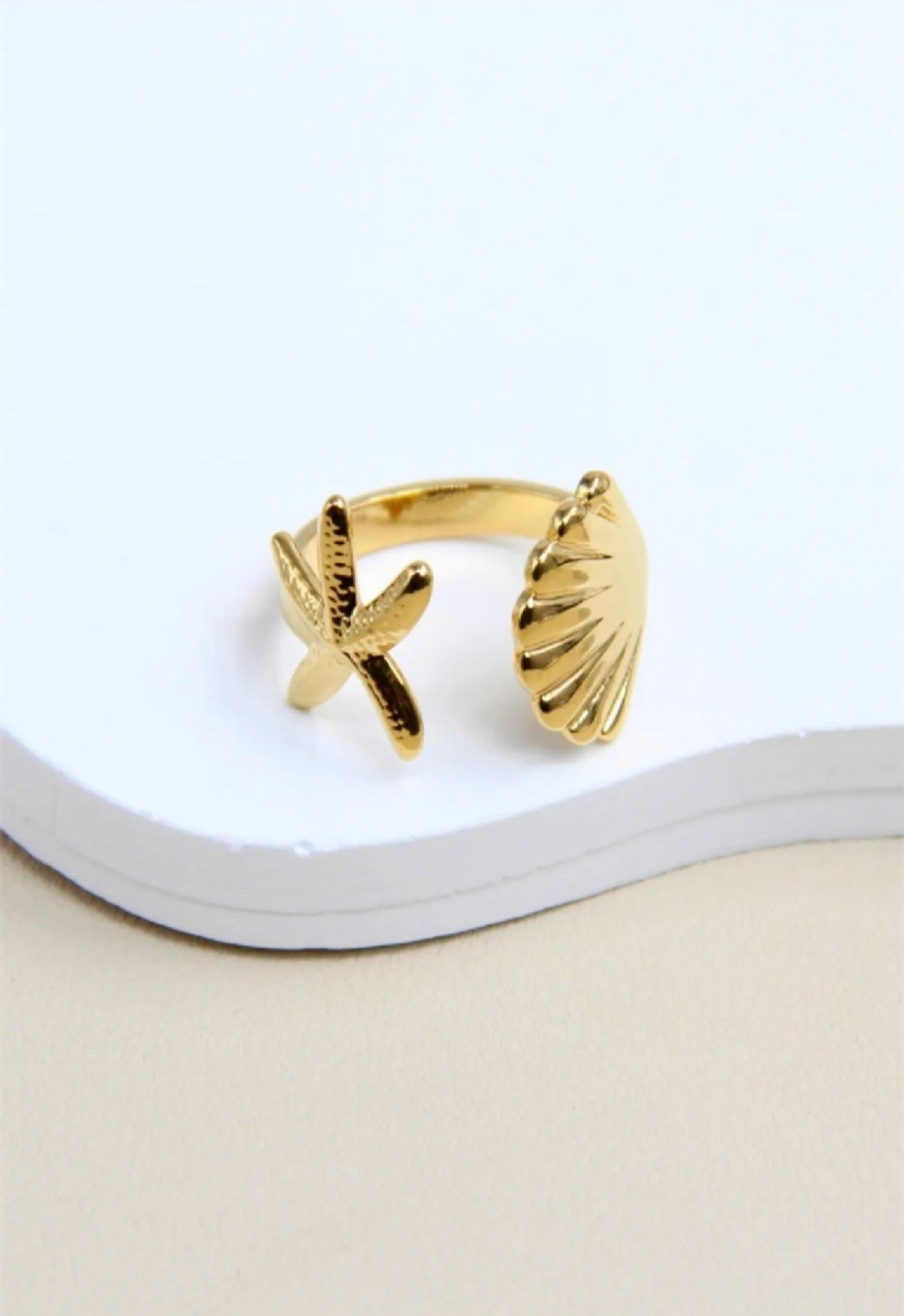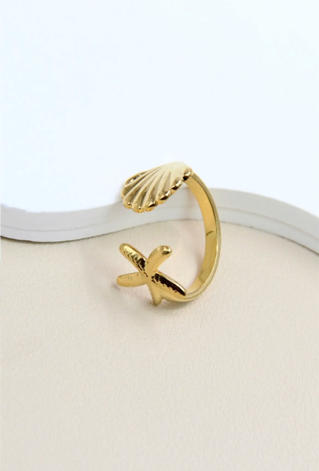 Charmante bague en acier inoxydable doré, ornée d'un coquillage et d'une étoile de mer.