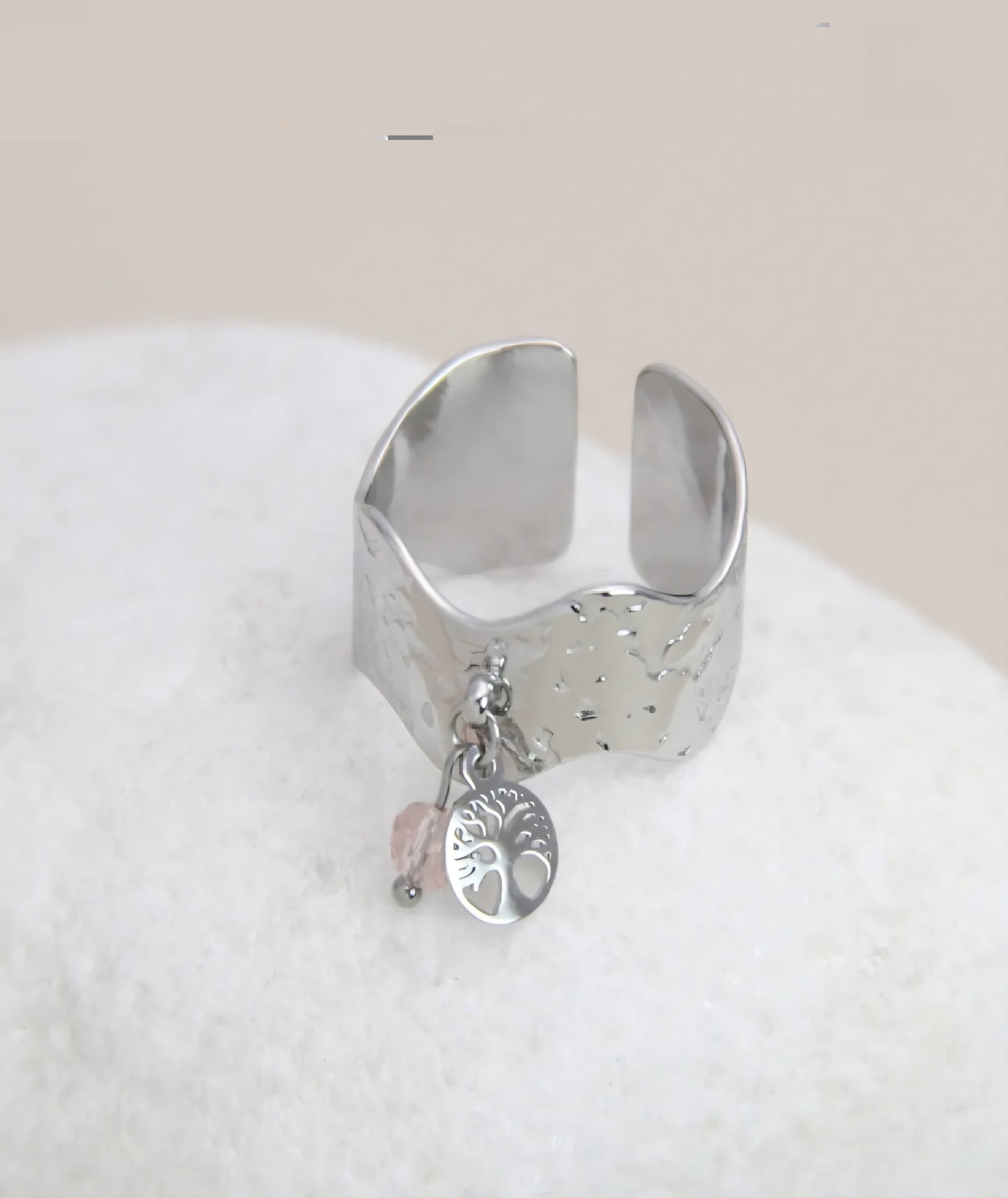 Bague ajustable à breloque arbre de vie en acier inoxydable.