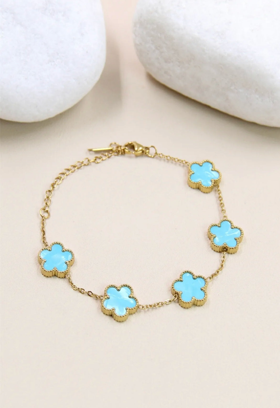 Bracelet en acier inoxydable doré et orné de cinq charms en forme de trèfle.