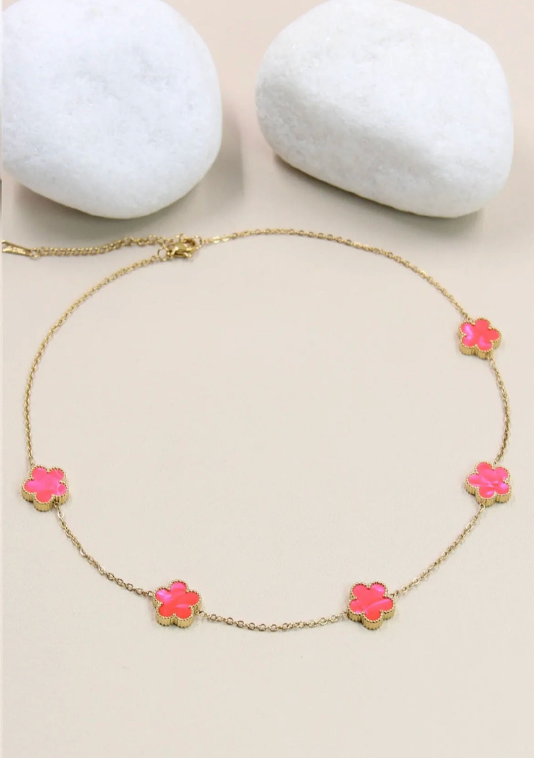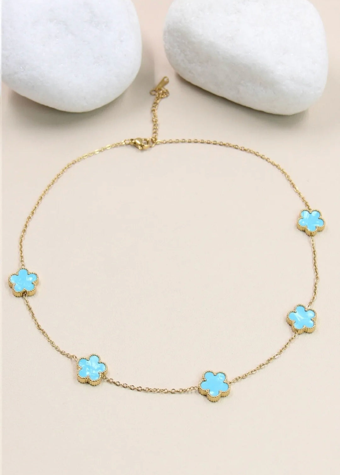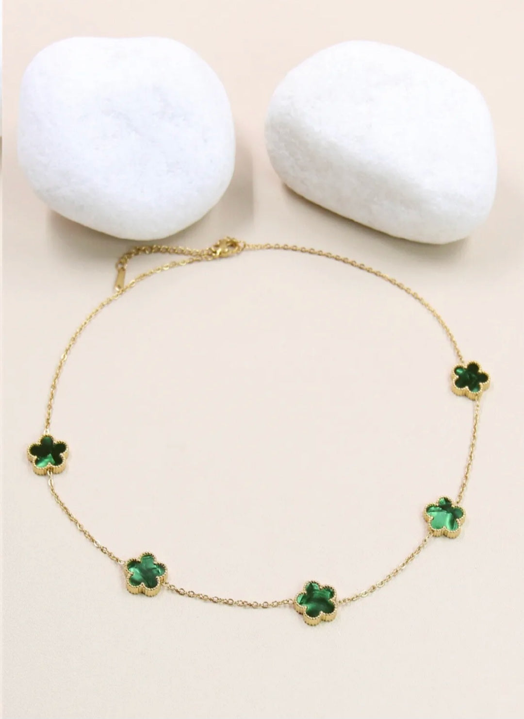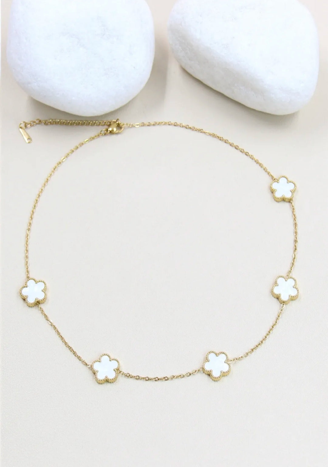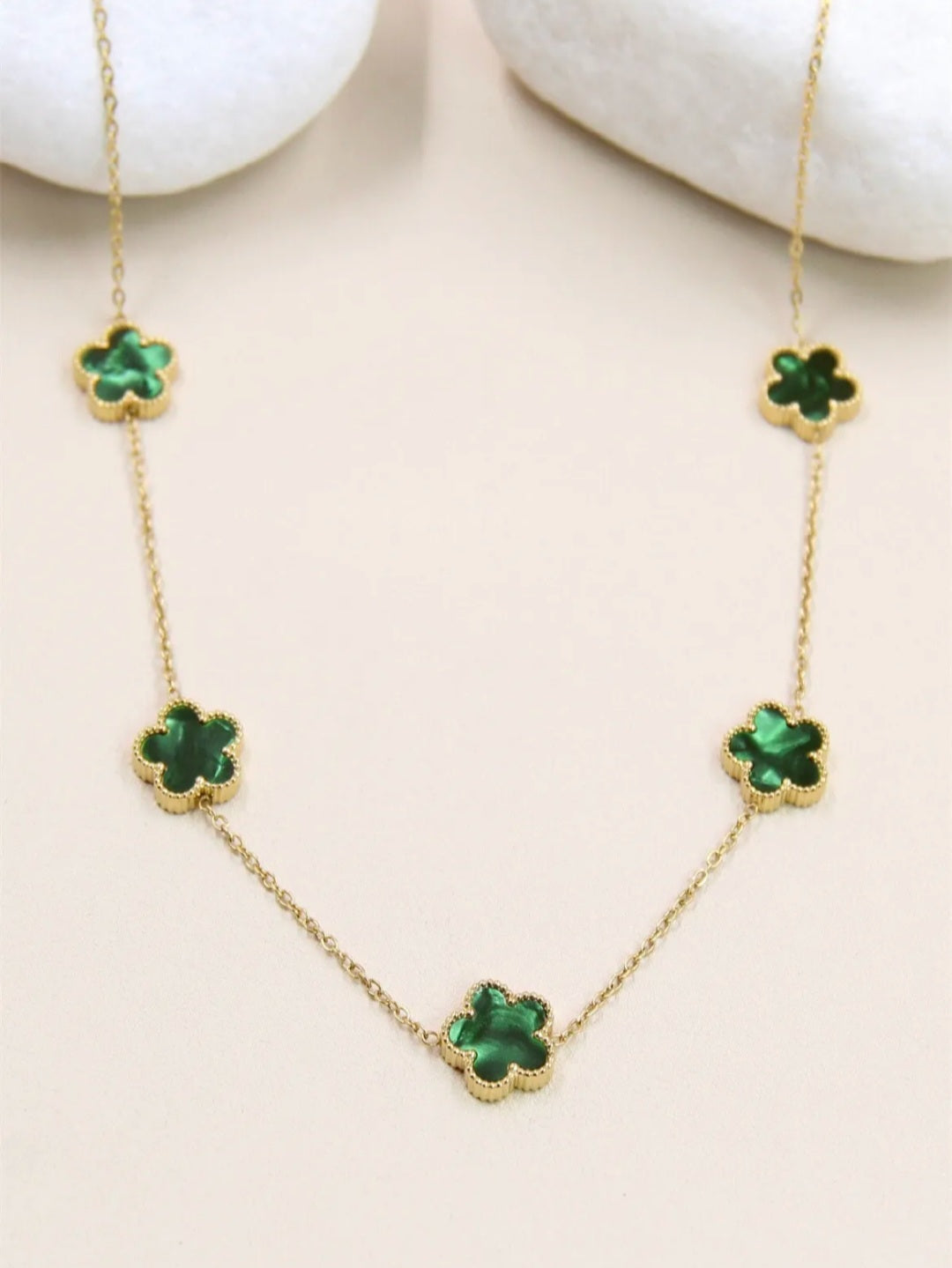 Collier en acier inoxydable doré et orné de cinq pendentifs en forme de trèfle, chacun incrusté de nacre.