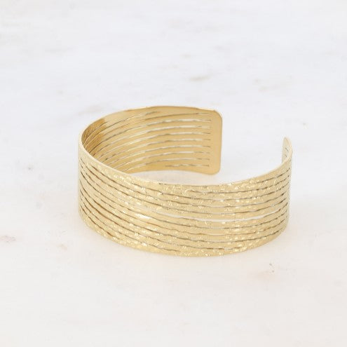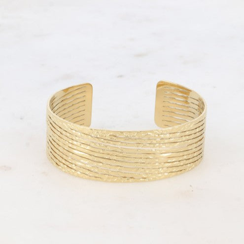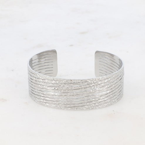 Bracelet type manchette ajourée en acier inoxydable composé de motifs végétaux gravés et d'ajours striés.