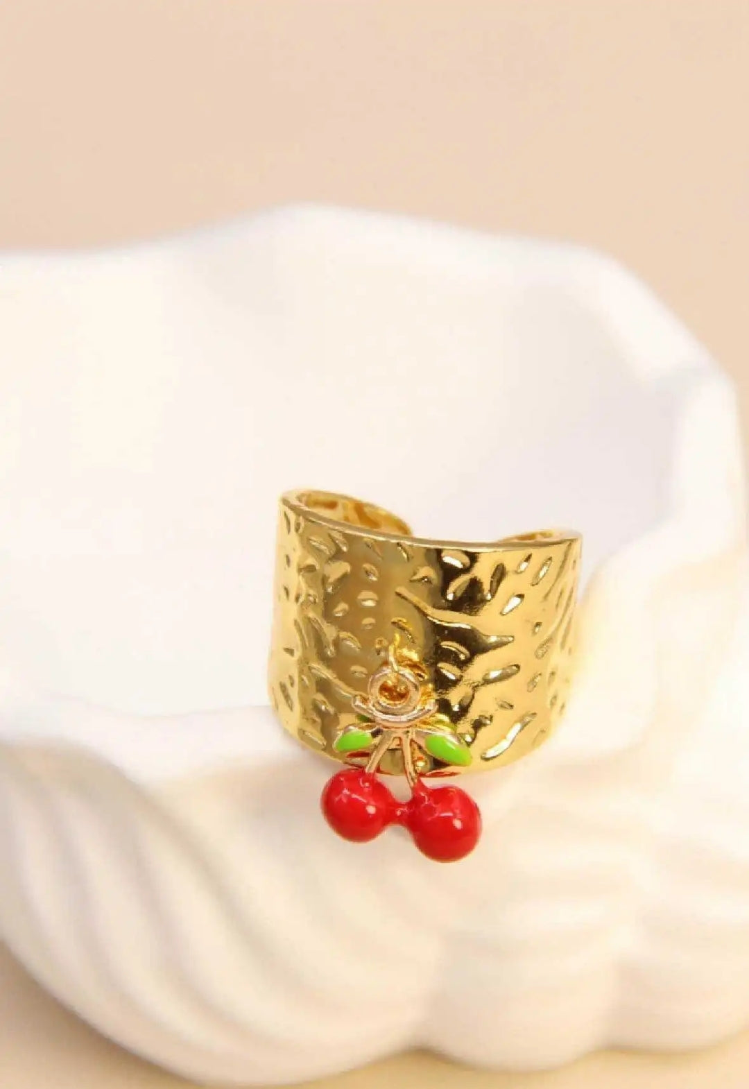 Laissez vous séduire par cette bague breloque cerise ajustable en acier inoxydable.