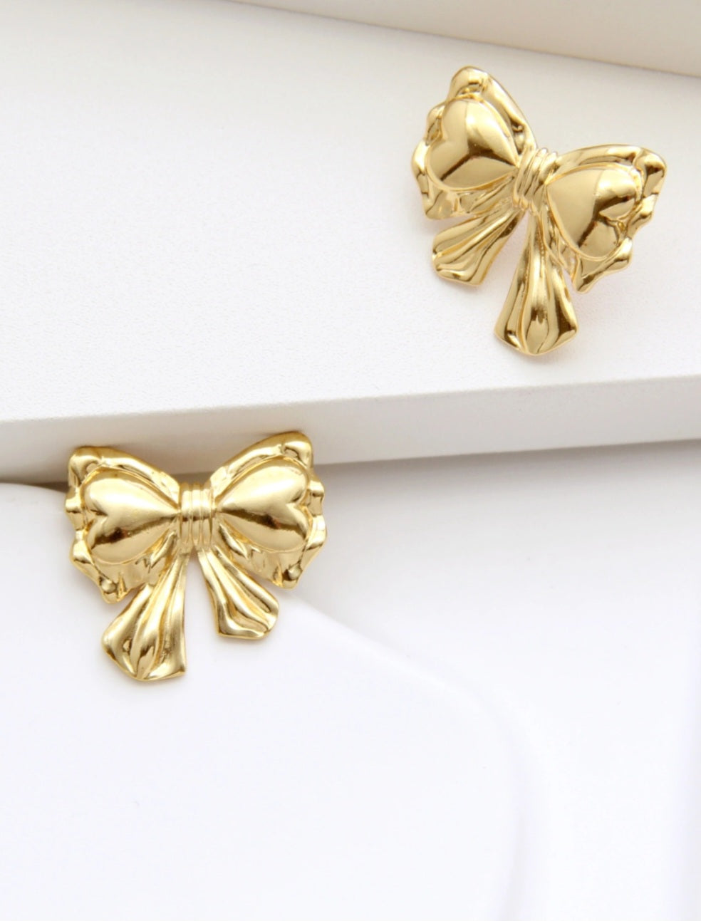 En acier inoxydable doré, elles se distinguent par leurs détails sculptés qui imitent l’effet d’un ruban délicatement noué.