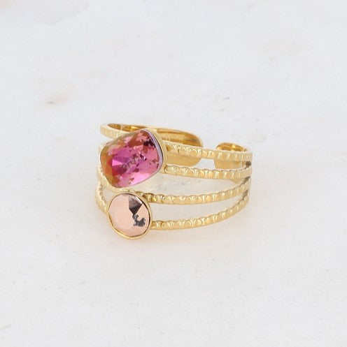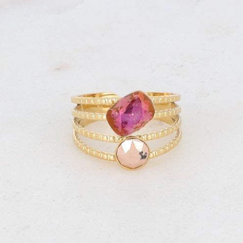 Bague en acier inoxydable composée de 4 rangs striés et sertie de deux cristaux taillés.