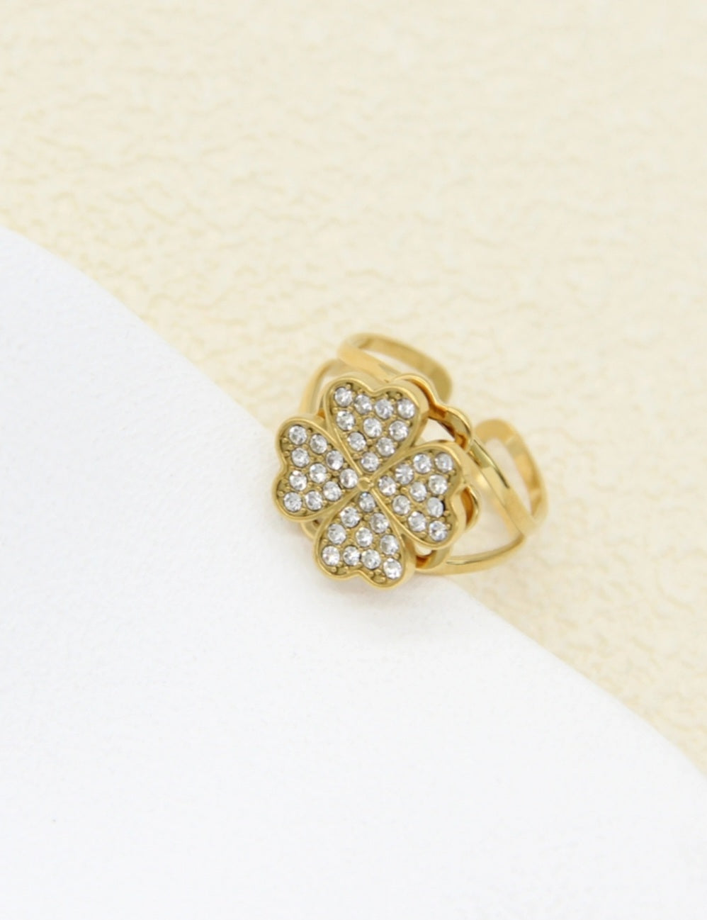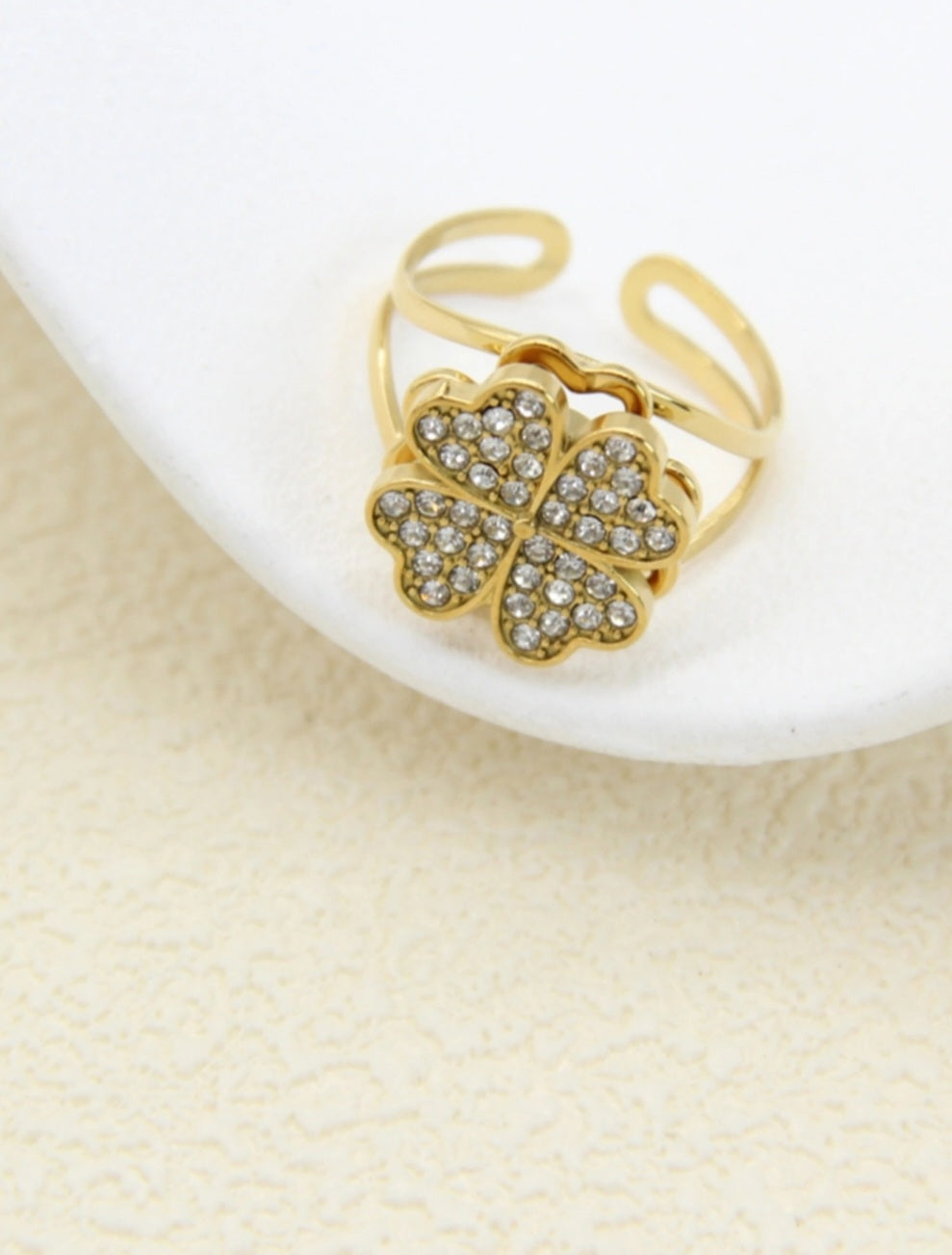 Élégante et ludique, cette bague anti-stress en acier inoxydable doré met en valeur un trèfle à quatre feuilles rotatif, symbole de chance, entièrement serti de strass étincelants.
