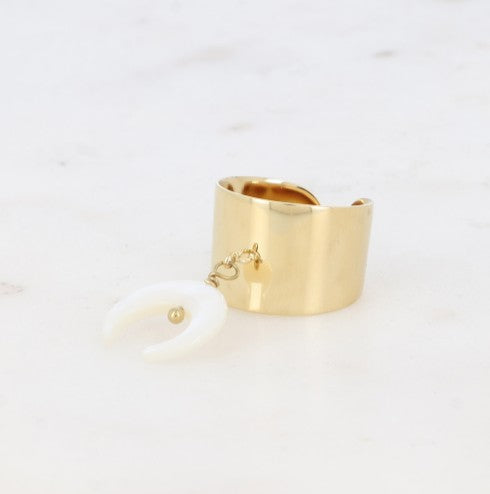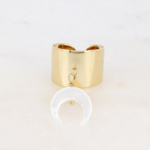 Bague large et lisse en acier inoxydable composée d'un pendentif lune en pierre naturelle.
