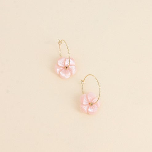 Boucles d'oreilles type créoles en acier inoxydable composées d'une petite fleur nacrée.