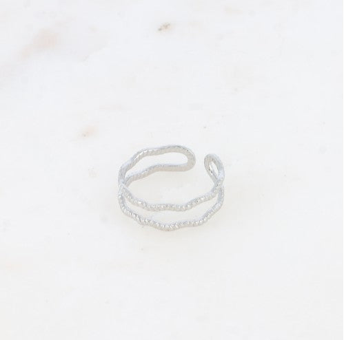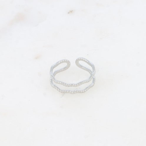 Bague en acier inoxydable composée de deux rangs striés en zigzag.