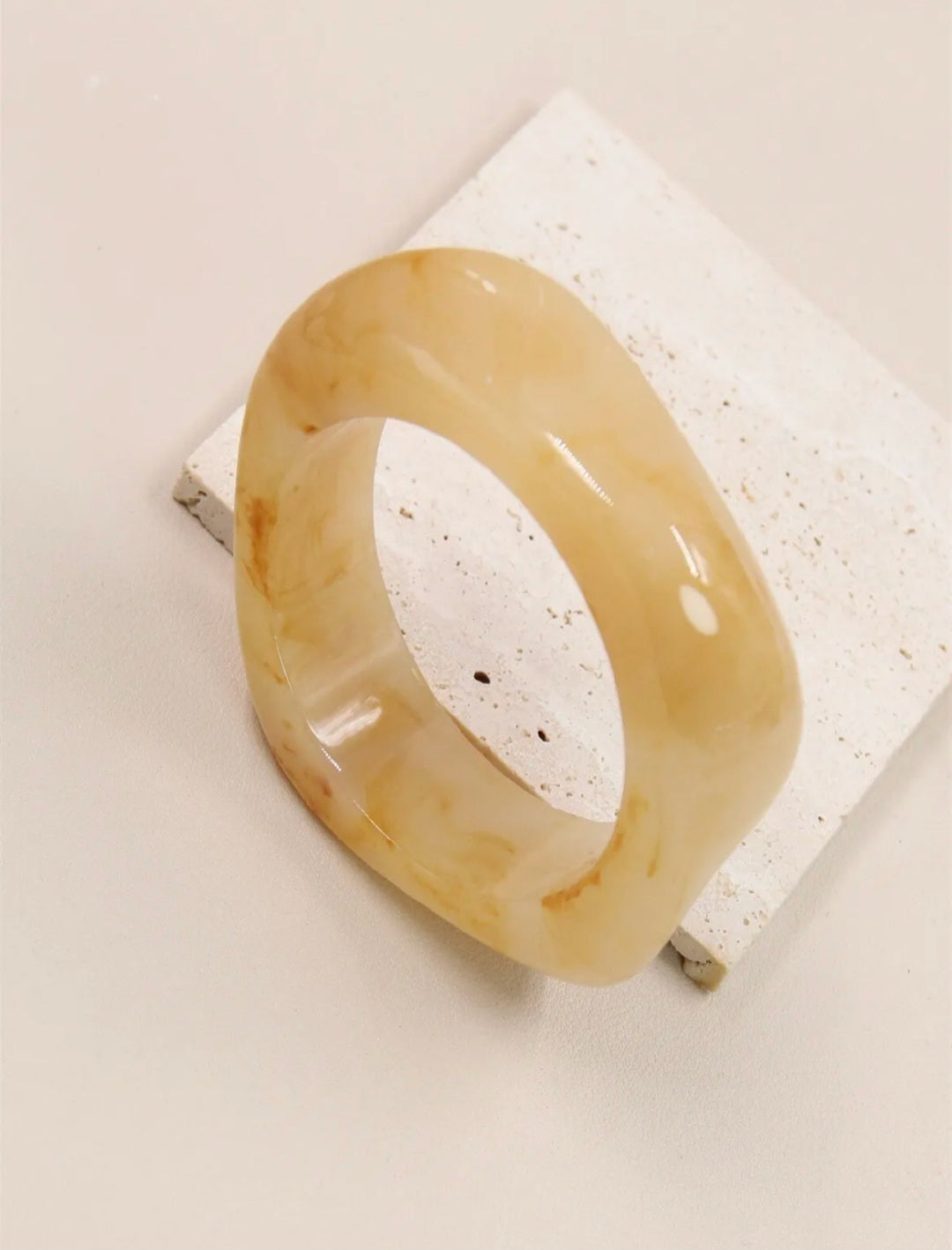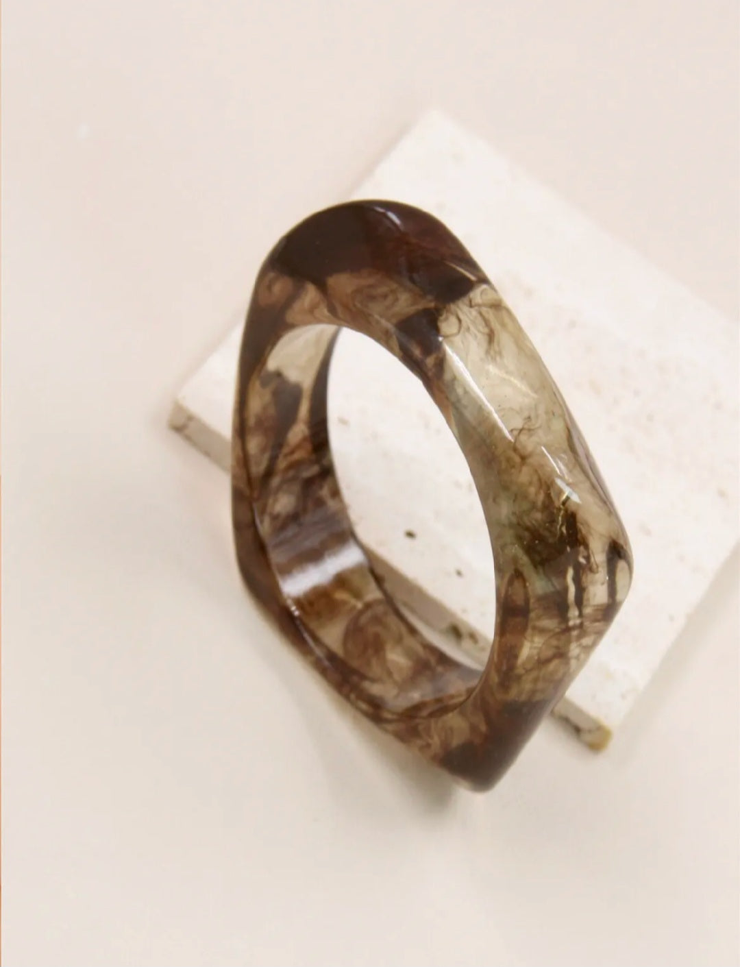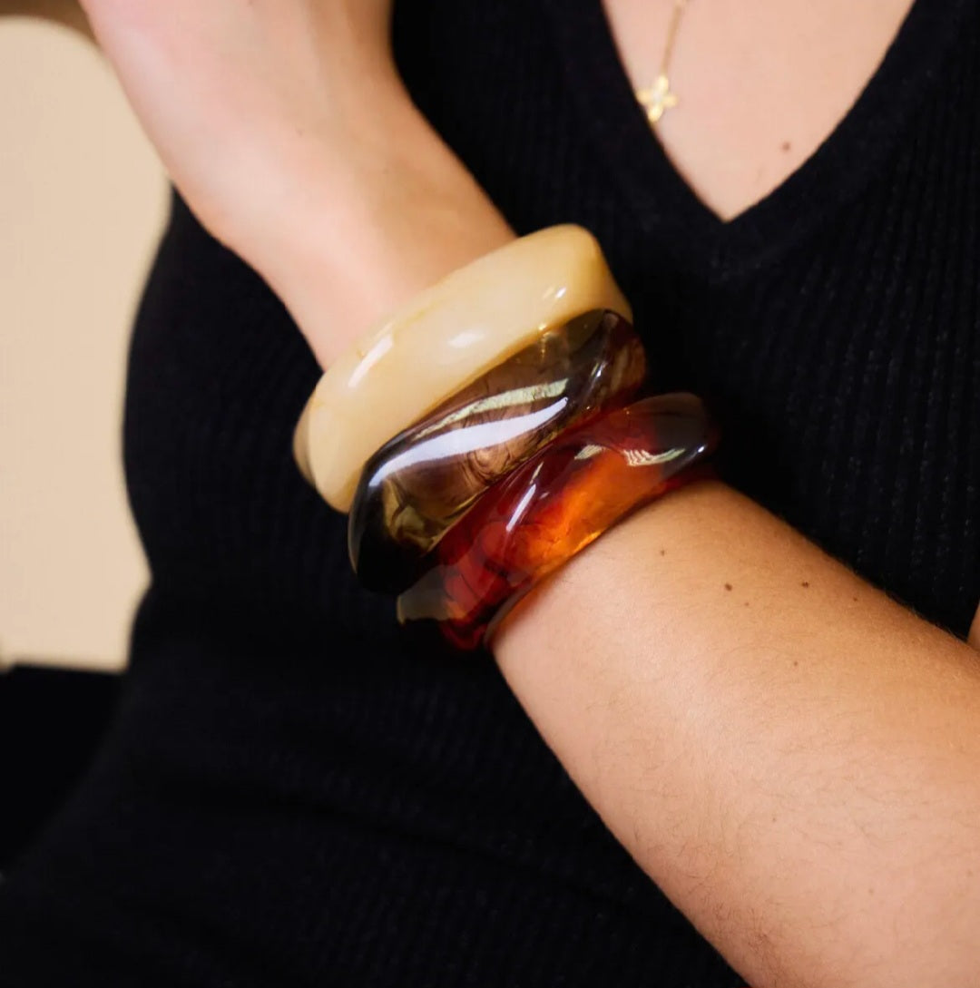 Le bracelet Onys est un jonc géométrique en résine de haute qualité, offrant une transparence et une brillance exceptionnelles. Disponible en beige, terracotta et gris profond, il se porte seul pour un style épuré ou associé aux autres coloris pour un look tendance.