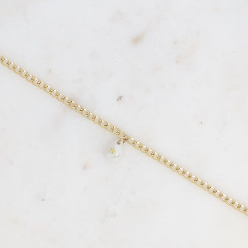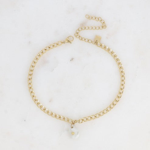 Bracelet de cheville en acier inoxydable composé d'une maille gourmette avec un pendentif en forme de goutte en pierre naturelle.
