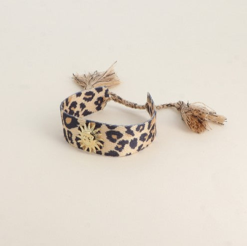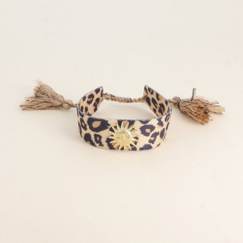 Bracelet composé d'un tissu aux motifs uniques et d'une pièce en acier inoxydable en forme de soleil.