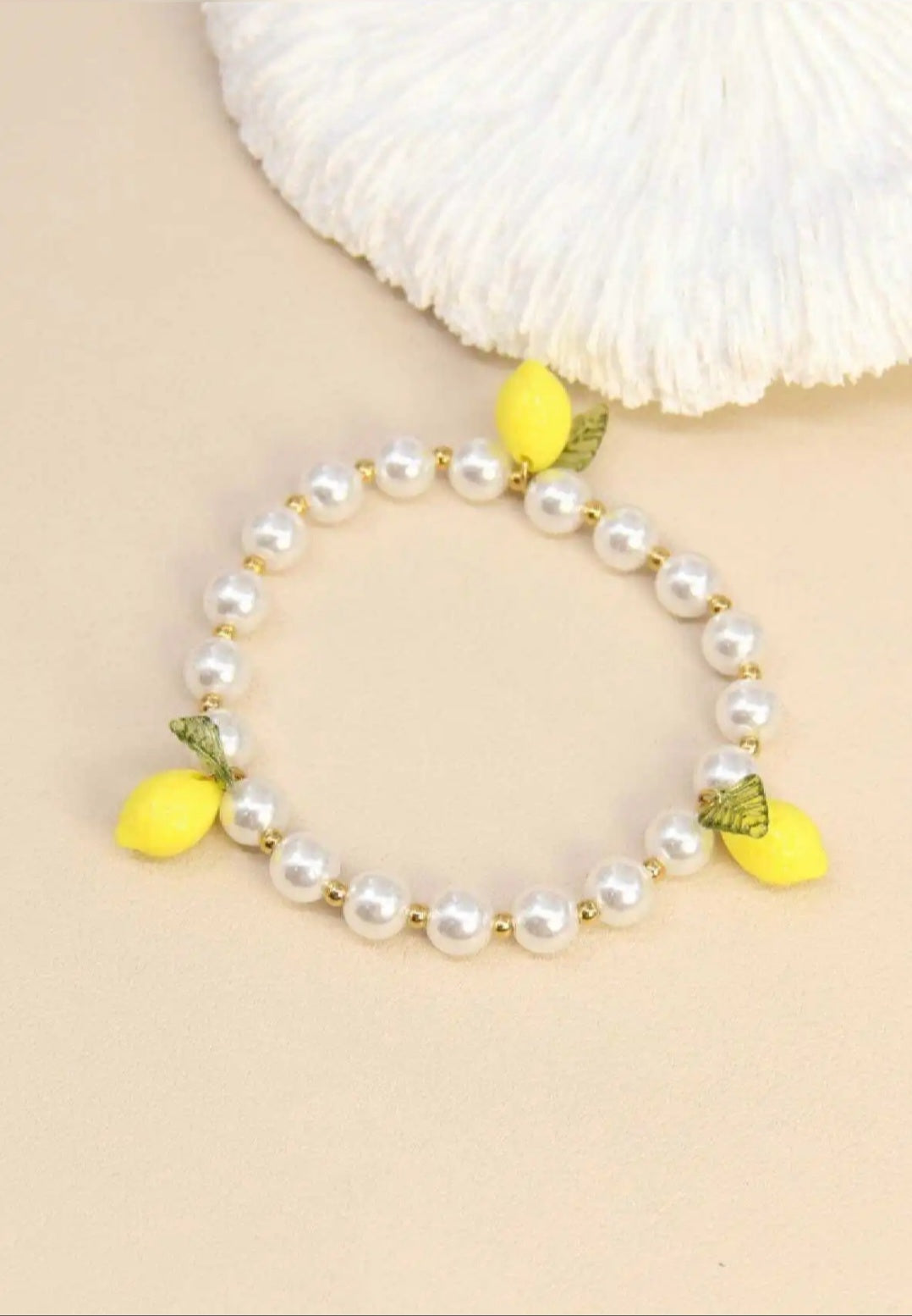 Ce bracelet élastique orné de perles nacrées et de petits citrons vitaminés est léger, souple et lumineux.