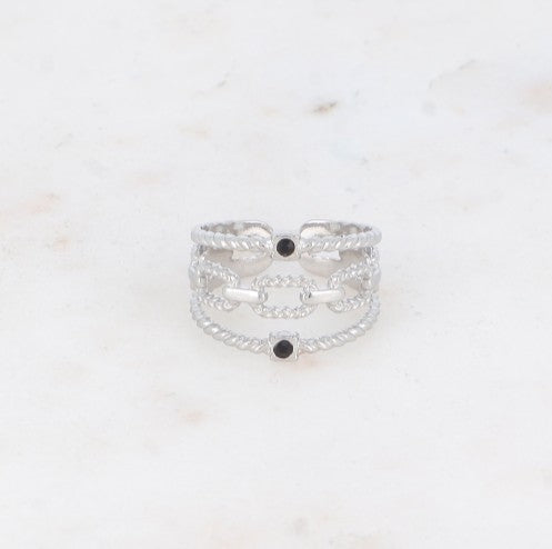 Bague en acier inoxydable composée de 3 rangs, 2 torsadés sertis d'un oxyde de zirconium et une en motif maille ajourée et texturée.