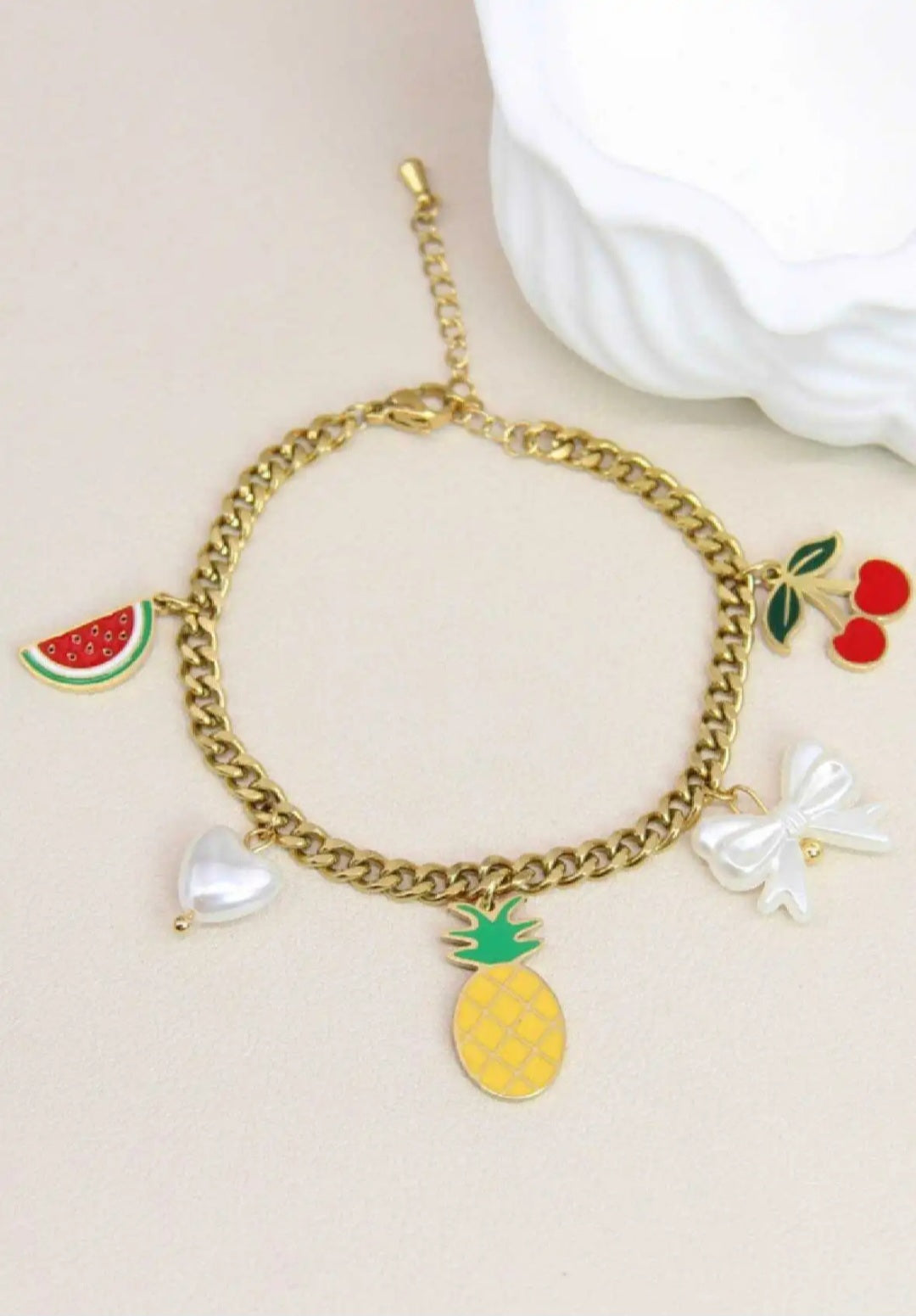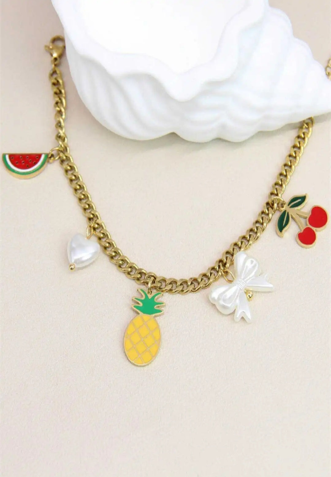 Un bijou en acier inoxydable orné de breloques pastèque, coeur, ananas, noeud et cerise.